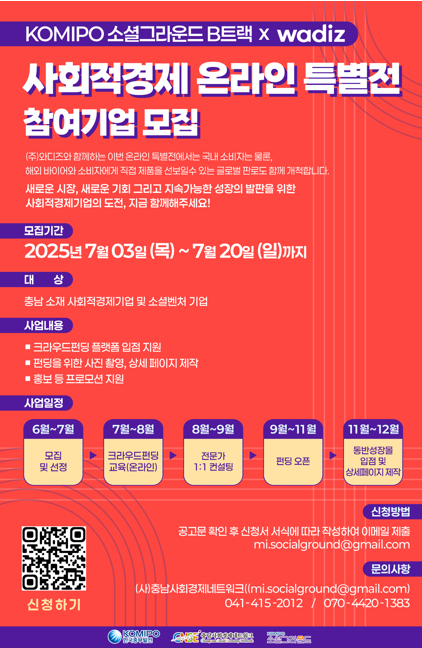 (사)충남사회경제네트워크에서 운영하는 사업 입니다. 2025년 KOMIPO 소셜 그라운드 B트랙 『사회적경제 판로지원』 온라인 특별전 참여기업 모집을 다음과 같이 공고 합니다.